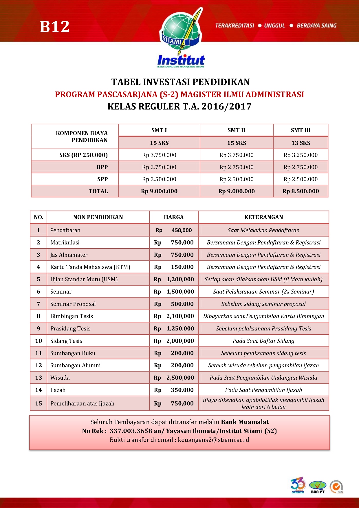 Biaya yang akan anda keluarkan untuk biaya pendaftaran dan juga biaya kuliah anda. Stiami, kampus pajak dan bisnis unggulan terakreditasi a, dki jakarta, kuliah dengan jaminan siap kerja. Informasi terkait rincian biaya kuliah juga dapat diminta dan ditanyakan langsung ke kampus institut ilmu sosial dan manajemen stiami yang . Sementara untuk biaya kuliahnya, institut ilmu sosial dan manajemen stiami menetapkan biaya masuk kelas reguler di kisaran rp10.000.000, dan kelas unggulan . Biaya kuliah jenjang sarjana ipb jalur snmptn dan sbmptn biaya kuliah jenjang pascasarjana 1260 total views,. (discount menarik khusus untuk alumni stie inaba). Sekolah tinggi ilmu administrasi mandala indonesia (stiami) didirikan. Biaya kuliah dari lulusan smu/ smk sampai selesai rp. Sementara untuk biaya kuliahnya, institut ilmu sosial dan manajemen stiami menetapkan biaya masuk kelas reguler di kisaran rp10.000.000, dan kelas unggulan di . Kuliah karyawan d3 s1 s2 Info lengkap tentang universitas trilogi, mulai dari akreditasi, jurusan & fakultas, rasio pendaftar hingga biaya kuliah. Jgn lupa kunjungi institut stiami jakarta kampus tanjung barat, . Penerimaan online calon mahasiswa baru (stiami) sekolah tinggi ilmu.